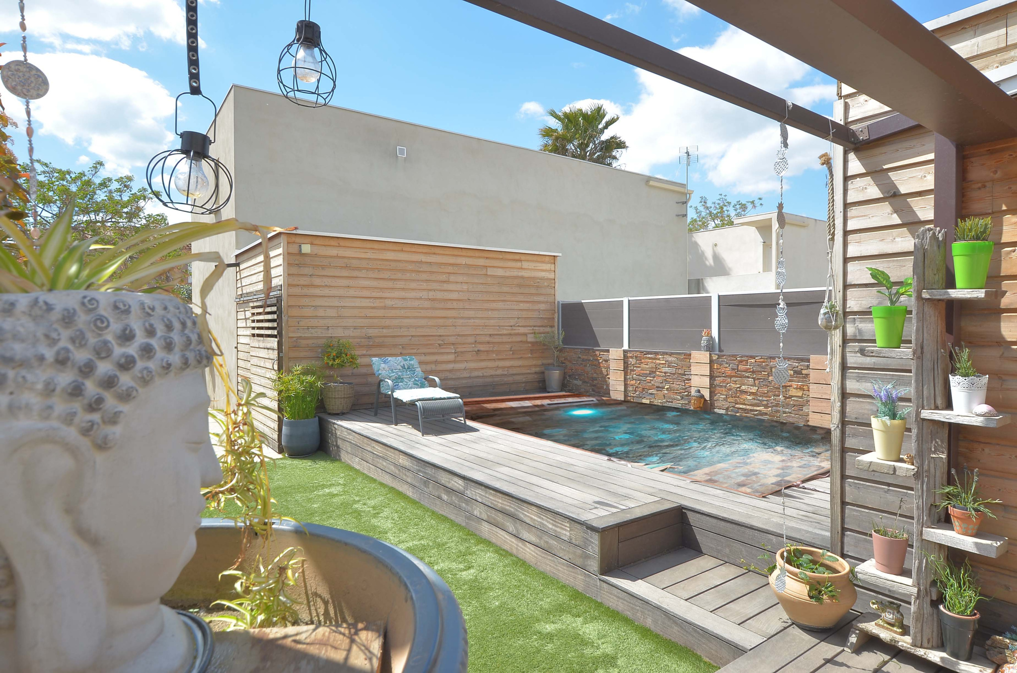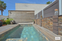 Ce projet architectural à ossature bois privilégie une construction rapide, propre et à faibles nuisances, tout en offrant un excellent confort. Il s'articule autour d'un espace piscine pensé comme un lieu de détente, invitant à profiter du soleil. Conçu pour recevoir, l'aménagement optimise l'espace et intègre un coin repas, un espace nuit et salle d'eau dans une atmosphère cosy et lounge, chaleureuse et contemporaine.